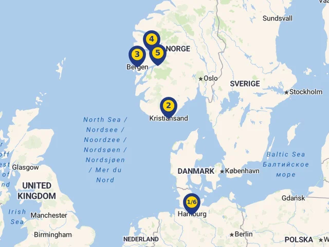 2Kristiansand, Nórsko20. 04. 2026, príchod o 07:00, odchod o 17:00