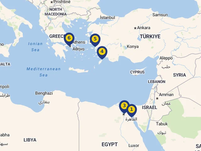 Spoznajte miesta, kde Vaša loď počas plavby zakotví! Každá zastávka je označená číslom, ktoré zodpovedá jej pozícii na mape, aby ste mohli jednoducho sledovať celú trasu. Stačí kliknúť na vybranú destináciu a zistíte viac o každej z nich. Pre ešte lepší prehľad si môžete celý program plavby prezrieť priamo na mape.