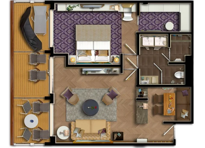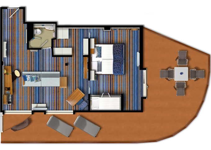 | SUTO - Themen Suite 54 m² + balkón 15 m² so stolom, ležadlom a hojdacou sieťou. Spálňa, obývacia časť, šatník. 10. paluba. Max 4 osoby. Výhody Suite. | 5 178 € 2 589 € za osobu | ||