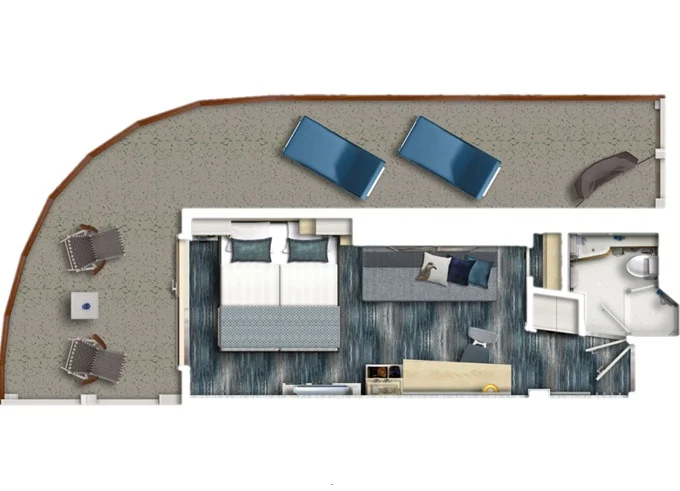 SUTO - Themen Suite 54 m² + balkón 15 m² so stolom, ležadlom a hojdacou sieťou. Spálňa, obývacia časť, šatník. 10. paluba. Max 4 osoby. Výhody Suite. 8 418 € 4 209 € za osobu