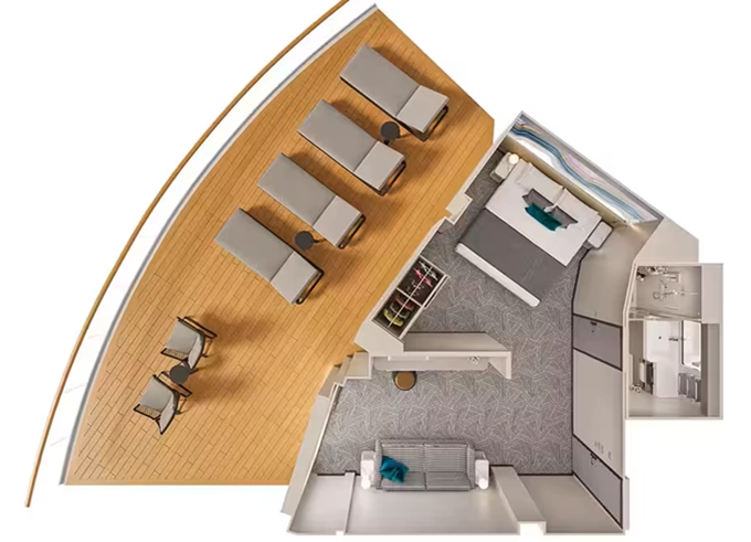 | SH - Suite s veľkým balkónom na korme 25 m² / balkón 34 m². 9. paluba - vzadu. Max 4 osoby. Výhody Suite. | 8 468 € 4 234 € za osobu | ||