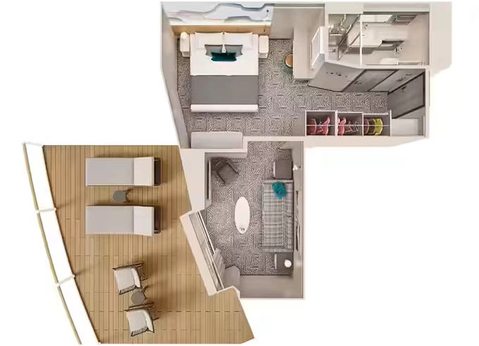 | HB - The Haven Aft-Facing Penthouse s balkónom 27-35 m² / balkón 12-20 m². 10. - 14. paluba vzadu. Max 4 osoby. Výhody The Haven. | 11 188 € 5 594 € za osobu | ||